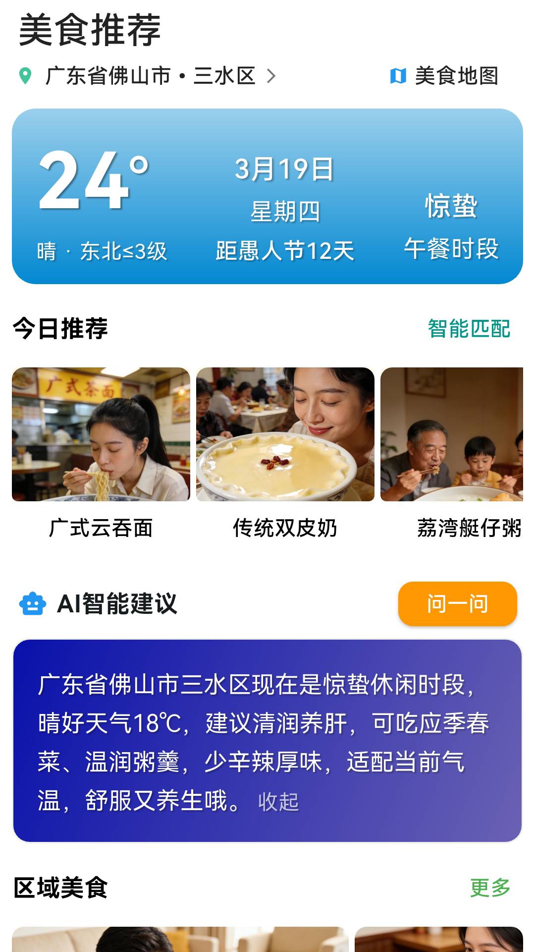根据位置天气节气智能推荐家常菜谱、各地特色美食,AI智能解答美食饮食问题。