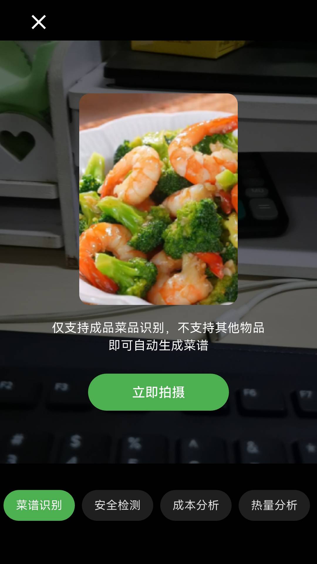 AI拍照识别菜谱做法、食材安全检测、食物热量计算、营养成分智能分析。